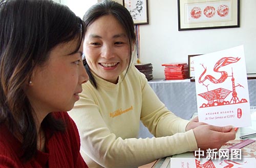 剪紙坊學(xué)員由社區(qū)重殘無業(yè)青年等一批弱勢人群構(gòu)成,他們雖然無法參加社區(qū)的迎博清掃、整治活動,但始終情牽世博會。為了表達(dá)她們迎博的心愿,學(xué)員們共同設(shè)計(jì)了以“中國心”為主題的剪紙圖案,“五•一”節(jié)當(dāng)天,剪紙坊學(xué)員走出校園,向執(zhí)勤在車站、路口的志愿者們贈送精心裁剪的“中國心”。完