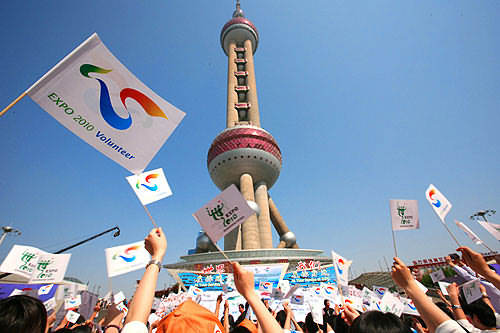 在東方明珠廣場,1500多位曾在上海舉辦的歷次重大活動中奉獻(xiàn)愛心的志愿者和各界市民代表齊集于此,參加世博會志愿者招募工作啟動儀式。啟動儀式前,上海市領(lǐng)導(dǎo)與志愿者代表們一起觀看了在北京天安門廣場舉行的中國2010年上海世博會天安門計(jì)時(shí)牌揭幕儀式的現(xiàn)場直播。