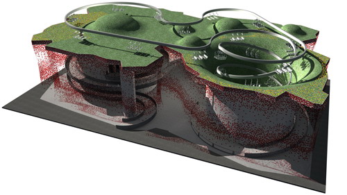 據(jù)了解,瑞士館主體結(jié)構(gòu)由兩個承重的大小圓柱和綠草如茵的屋頂組成,館內(nèi)底層展廳營造的都市空間和館頂?shù)淖匀豢臻g相互呼應(yīng),觀光纜車帶領(lǐng)參觀者往返其間,給人以身臨其境,在城市和鄉(xiāng)村之間優(yōu)游的美好感受。瑞士館另一大亮點是其互動閃光的帷幕外墻,將由半透明的鋁網(wǎng)結(jié)構(gòu)帷幕覆蓋,11000塊包含敏化太陽電池的的生物樹脂懸掛其上,與展館周圍的能量如陽光和相機的閃光發(fā)生反應(yīng),整個外墻呈現(xiàn)一種動態(tài)閃光的視覺效果,以此展示能源的利用。