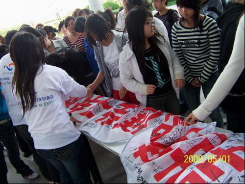 活動現(xiàn)場,學生們踴躍報名并在“思博學子爭做世博志愿者”橫幅上簽名留言,表達了愿為世博服務的決心。