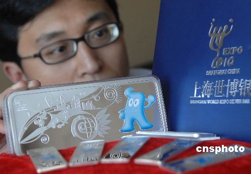 5月22日,由上海世博會事務協(xié)調局授權、中國印鈔造幣總公司鑄造發(fā)行的一款以世博會為題材的銀條——上海世博銀將于近日在交通銀行指定網(wǎng)點銷售。據(jù)了解,本次即將發(fā)售的上海世博銀以上海世博會為題材,設計上則融入了世博會吉祥物、地球與花朵、城市場景等眾多元素,由人和城市場景共同組成“EXPO”圖案也完美體現(xiàn)了此次上海世博會的“城市”主題。中新社發(fā) 遠舟 攝