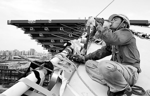 下午兩點(diǎn),記者帶著溫度計(jì)來(lái)到世博工地外國(guó)館片區(qū),陽(yáng)光下,水銀柱停留在40攝氏度上。走上5分鐘,汗水濕透了全身。高溫挑戰(zhàn)著每個(gè)建設(shè)者的意志力。在法國(guó)館將要完成的鋼結(jié)構(gòu)屋頂上,幾個(gè)工人正在安裝最后的鋼架,為了避免曬傷,他們穿著長(zhǎng)袖長(zhǎng)褲的工作服,戴著安全帽。從屋頂爬下來(lái)時(shí),每個(gè)人都像是剛從水里撈上來(lái)的。工人老張說(shuō),安全帽不能脫,汗水一刻不停地沿著帽子流下來(lái),眼睛都睜不開(kāi),得一直用手擦。