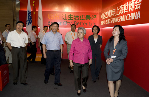 吳儀對(duì)展覽內(nèi)容都十分關(guān)注。她仔細(xì)觀看展品,認(rèn)真聽取介紹,并不時(shí)向工作人員詢問有關(guān)情況,了解世博會(huì)籌備的最新進(jìn)展,對(duì)籌辦工作取得的成績給予充分肯定。