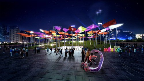 墨西哥館占地面積4000平方米,將展示墨西哥的歷史、文化和夢想。據(jù)墨西哥館相關(guān)負責人介紹,進入墨西哥館,參觀者就好似開始了一段從史前時代到未來的墨西哥歷史旅程。展覽的第一部分為“回顧過去”,投影到地板上的三個屏幕將分別反映墨西哥史前城市、殖民地城市和19世紀城市的風貌;第二部分為“了解現(xiàn)狀”,空間中充滿了不斷運動和投映的元素,代表著城市的現(xiàn)實動態(tài)。在這里,就好像站在現(xiàn)實的窗口前,參觀者能夠看到墨西哥的現(xiàn)狀;第三部分則為“展望未來”,主辦方為參觀者提供了一些互動表格,其中列出了一些信息,用于交流與創(chuàng)設(shè)更好的墨西哥發(fā)展計劃、未來項目以及可持續(xù)環(huán)境計劃。在整個旅程的終點,參觀者將通過一個有三個屏幕的狹小空間,看到位于展廳頂部的風箏廣場的實時圖像,圖像將顯示正在廣場進行的活動,隨后參觀者會被邀請登上廣場,成為廣場活動的一部分。