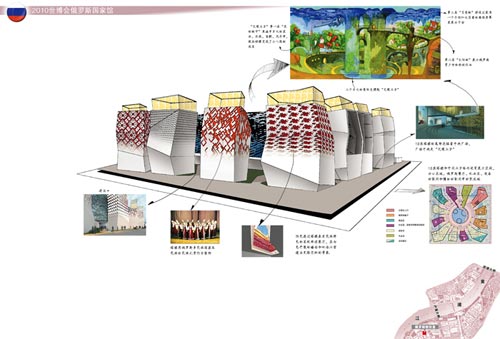 俄羅斯館占地6000平方米,是世博會最大的展館之一。它的外圍是12座不規(guī)則形狀的塔樓,聳立于草坪和水景之間,塑造出俄羅斯館傳統(tǒng)與現(xiàn)代相結(jié)合的外形。