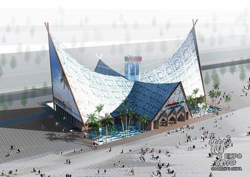 占地面積3000平方米的馬來(lái)西亞館,將采用可循環(huán)利用的油棕、塑膠等材料建筑而成,重點(diǎn)展現(xiàn)馬來(lái)西亞的獨(dú)特風(fēng)情和團(tuán)結(jié)的民族精神。展館的設(shè)計(jì)靈感源自馬來(lái)西亞傳統(tǒng)建筑。整個(gè)建筑由兩個(gè)高高翹起的坡屋頂組成,線條優(yōu)美而極具動(dòng)感,屋頂尖端的交叉構(gòu)架是馬來(lái)西亞本土建筑的一個(gè)符號(hào)。