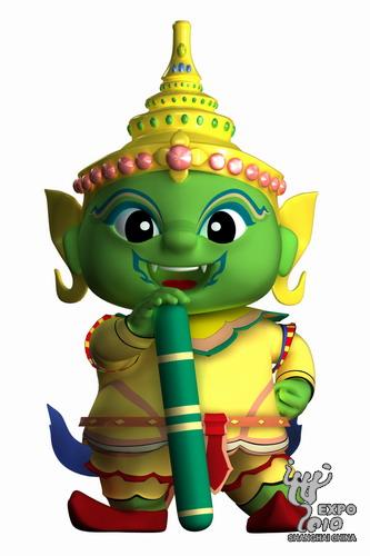 “小阿泰”名字來自泰語的“THAI”(自由和獨(dú)立),設(shè)計(jì)靈感來自守護(hù)在泰國(guó)寺廟門前的泰國(guó)守門神夜叉“INTARACHIT”塑像,這個(gè)可愛的小巨人以他彬彬有禮、充滿歡樂的微笑象征著泰國(guó)人的熱情好客!靶“⑻钡木G色皮膚代表富饒的泰國(guó)大地,橢圓形的大眼睛如同泰國(guó)人友好和善良的心靈窗口,自然純真的微笑充滿著溫馨和友善,手握的巨棒具有創(chuàng)造幸福、實(shí)現(xiàn)夢(mèng)想的神奇威力。