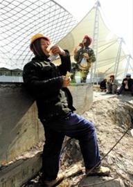 沒有老資歷的工人,卻意外遇到位老資歷的小販。世博軸邊上,在工地賣燒酒的葛師傅告訴記者,他做工人們的生意,已經(jīng)快滿三年了……
