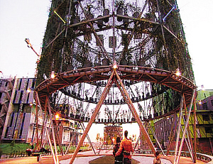 晚上,則一定要先去“生態(tài)氣候樹”。來到“氣候樹”內(nèi)部的公共廣場,站在數(shù)百平方米的廣場上,你會(huì)立刻體會(huì)到炎炎夏日的“冰爽”感覺。因?yàn)檫@里運(yùn)用了先進(jìn)的環(huán)境科技手段,人造出了一個(gè)“露天空調(diào)房”。當(dāng)你欣賞演出、觀看馬德里視頻時(shí),可別忘了琢磨其中奧妙。(千鶴 蘭翔)