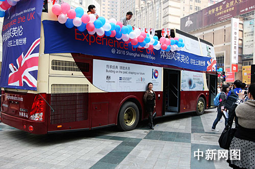 中新網(wǎng)重慶3月19日電(銀雪 郭晉嘉)19日,一輛英國傳統(tǒng)雙層大巴駛?cè)胫貞c最繁華的商貿(mào)中心解放街,宣傳上海世博會英國館及相關(guān)活動,呼吁重慶市民使用公共交通工具出行,倡導(dǎo)低碳活動。