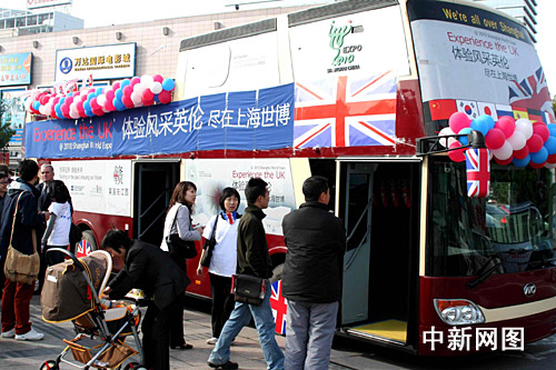 記者在現(xiàn)場(chǎng)看到,這輛雙層世博大巴上噴有英國(guó)館“蒲公英”圖案,紅藍(lán)白三色氣球以及“體驗(yàn)風(fēng)采英倫,盡在上海世博”的宣傳語(yǔ),讓人一目了然。