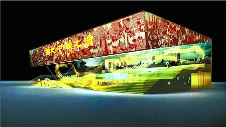 據(jù)介紹,河南館的建筑外形由一個“中”字變形而來,分上中下三層空間,其中中部構(gòu)成一個全開放的坡面空間,為展館主體,上層空間主要是穹頂裝置,下層空間則設(shè)計為一個藏寶室。展館主體空間,也就是中部的坡面空間,各展項(xiàng)依照“河南城市文明的盛大游行”概念,按時代順序組織排列。在設(shè)計上,除了各項(xiàng)多媒體裝置在內(nèi)容上的呼應(yīng)支撐外,還由數(shù)千個文物復(fù)制品、人物模型組成了一個實(shí)體的、起伏綿延的游行隊(duì)伍,再加上繽紛變化的燈光效果,整個主體空間呈現(xiàn)給人的仿佛是一場盛大演出。