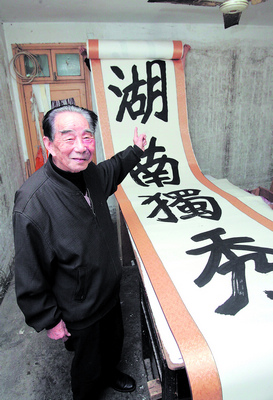 章桂佛是長(zhǎng)沙縣鹿芝鄉(xiāng)人,離休前是一位教育工作者,擅長(zhǎng)書(shū)法,喜歡寫(xiě)詩(shī)。2008年奧運(yùn)會(huì),老人寫(xiě)出了以“同一個(gè)世界,同一個(gè)夢(mèng)想” 為主題的21米書(shū)法長(zhǎng)卷,并獲國(guó)際奧林匹克藝術(shù)銀獎(jiǎng)。今年春節(jié)前,老人不顧年事已高,毅然揮毫潑墨開(kāi)寫(xiě)百米長(zhǎng)對(duì)聯(lián),歌頌上海世博會(huì)。