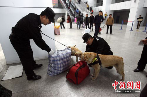 上午10時(shí)左右,記者在徐州火車站候車大廳看到,1歲左右的警犬“邁克”、“喬丹”“兄弟倆”在馴導(dǎo)民警的帶領(lǐng)下,精神抖擻地走進(jìn)火車站,正式上崗巡防。據(jù)了解,該警犬均為“拉不拉多”犬種,長(zhǎng)相類似寵物犬,性情溫順,不具攻擊性。“邁克”、“喬丹”上崗前,已經(jīng)在警犬訓(xùn)練基地進(jìn)行了集中封閉訓(xùn)練。民警告訴記者,在巡防時(shí)如果發(fā)現(xiàn)可疑物品,它們將采取坐下來“示警”的方式,提示馴導(dǎo)民警。隨后,記者來到安檢通道附近見到,所有旅客均在工作人員的引導(dǎo)下將隨身攜帶的物品通過安檢儀。