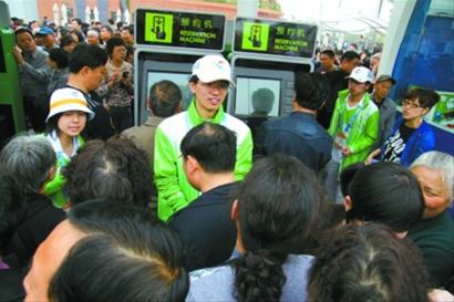 上午9時許,記者來到位于亞洲廣場兩個最靠近中國館的預(yù)約點,近20臺預(yù)約機(jī)滿負(fù)荷運(yùn)作,可排隊等候的長龍還是一直蜿蜒到了人行通道上。記者了解到,短短一個小時里,中國館一天5萬個參觀名額幾乎全部滿額。