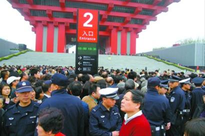 上午10點,由于人流過于擁擠,亞洲廣場旁的預(yù)約點預(yù)約機(jī)陷入癱瘓,全面停止了預(yù)約。工作人員在現(xiàn)場用擴(kuò)音機(jī)與排隊的參觀者隔空喊話,大約10多分鐘后,人潮漸漸散去。對于這個突發(fā)的情況,預(yù)約點的工作人員表示,希望參觀者可以自行分流,雖然有些預(yù)約點的地理位置離中國館相對較遠(yuǎn),但每張預(yù)約券都預(yù)留了至少1個小時的提前量,如果9點打印的預(yù)約券,上面的預(yù)約時間至少是10點以后,因此,無論在展區(qū)的任何一個預(yù)約點預(yù)約,走到中國館參觀都是來得及的。