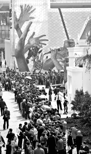 拿到中國(guó)館預(yù)約券的游客欣喜,沒(méi)拿到的也十分平和。錢(qián)先生夫婦9時(shí)45分入園時(shí),中國(guó)館預(yù)約券已發(fā)放完畢,他們就在亞洲廣場(chǎng)上的預(yù)約機(jī)上預(yù)約了主題館的參觀!爸袊(guó)館反正是永久性建筑,以后再來(lái)看也不遲,”同樣未能拿到預(yù)約券的李先生告訴記者。