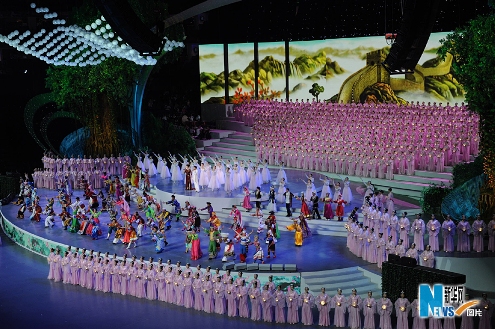 隨后,中國香港著名影星、上海世博會(huì)形象大使成龍也出現(xiàn)在舞臺(tái)上,與宋祖英一起演唱《和諧歡歌》,同時(shí)中國56個(gè)民族的舞者,也踏著慶典舞步,以中華民族共同的熱情,層層出現(xiàn)在舞臺(tái)上翩翩起舞,歡迎世界各地賓客的到來。