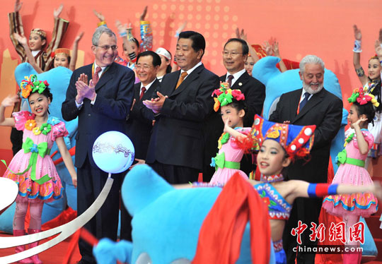 致辭完畢,賈慶林與讓·皮埃爾·藍(lán)峰共同啟動開園按鈕,象征性地開啟了2010年上海世博會的大門。按鈕啟動后,前方一個(gè)裝置設(shè)備上的圓環(huán)慢慢圍繞一把“金鑰匙”旋轉(zhuǎn)起來,形如一個(gè)地球儀,效果令人印象深刻。
