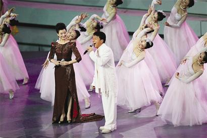 約半個(gè)小時(shí)的開幕式演出,聚合了五大洲的頂級明星,星光璀璨照耀浦江。在嘉賓入場后,由上海大學(xué)生組成的800人合唱團(tuán)唱起一曲《和諧歡歌》,“鮮花簇?fù)砑s定地方,熟悉沒見過的臉龐,呼喚聽見心靈激蕩,邀世界分享……”著名歌唱家宋祖英和國際巨星成龍攜手出場,為本次世博會開幕唱響第一個(gè)強(qiáng)音。