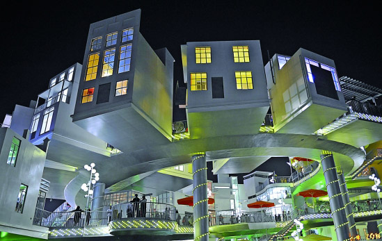很多場館在設(shè)計(jì)時(shí),就考慮了夜間效果,用燈光展示場館的另一面。浦東園區(qū)“燈光秀”的主打陣地是“一軸四館”。要欣賞夜景,首選地是世博文化中心:白天,它是潔白的巨型飛碟;夜晚,它變身神秘的“浮游都市”。