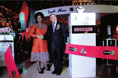 南非世界杯將于6月11日開幕,這是世界最高級別的足球盛會首次踏足非洲大陸。世博會南非館開館儀式上,李肇星與南非國際關(guān)系與合作部長馬沙巴內(nèi)共同摁下了南非世界杯的倒計時牌!笆澜绫陂g,世博會南非館將不間斷播放世界杯比賽,歡迎大家來看!”馬沙巴內(nèi)向參觀者發(fā)出了邀請。
