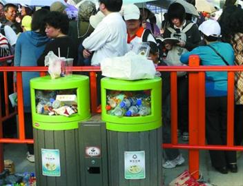 在世博中心附近的一位志愿者說,行人們?cè)趤G棄垃圾的時(shí)候,一般對(duì)桶身上的提示標(biāo)識(shí)不太在意,很少有人能分清“可回收物”、“其它垃圾”或“有毒垃圾”。為了體現(xiàn)環(huán)保、低碳理念,遍布園區(qū)的分類垃圾桶采用了特別“環(huán)保材料”。桶身上的一段文字向游人說明,材料由丟棄的牛奶紙盒、一次性快餐盒等經(jīng)過粉碎高溫處理、壓制而成,節(jié)約了資源。“一個(gè)環(huán)保桶相當(dāng)于節(jié)省了一棵成長五年的樹,減輕了原材料生產(chǎn)所消耗的能量!