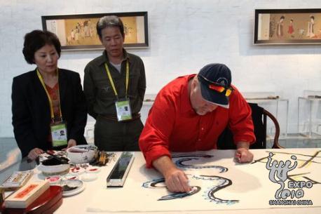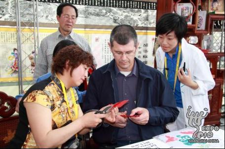 除制瓷以外,參觀寶鋼大舞臺(tái)的外國(guó)游客還常常熱衷于剪紙、織錦、皮影、旗袍等中國(guó)傳統(tǒng)文化,常常盯著一件作品看上老半天,如果碰巧遇上創(chuàng)作演示,更是不看到成品不罷休。每逢這時(shí),獻(xiàn)藝的各位工藝大師總是會(huì)熱情地邀請(qǐng)他們親自試一試,剪下一朵花,或畫下一尾魚,體驗(yàn)中國(guó)文化的奇妙。大師們頗有心得地說(shuō),語(yǔ)言不是障礙,微笑就是最好的溝通。