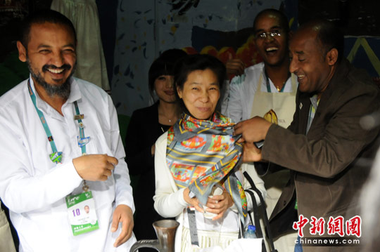 非洲聯(lián)合館管理部部長陳錦田為張根囡配帶上限量版的榮譽徽章,并向她贈送非洲聯(lián)合館出版的《非常非洲》、《非洲故事》兩本書的首冊。埃塞俄比亞參展總代表Sisay Getachew還邀請她到埃塞俄比亞展區(qū)品嘗咖啡,并親自為其佩戴當?shù)貒怼?/p>