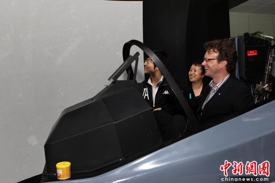 來到大型飛機(jī)模擬機(jī)展區(qū),大山嫻熟地坐進(jìn)駕駛艙體驗飛行!澳鞘瞧謻|、這是陸家嘴!彼贿叢倏v模擬機(jī),一邊辨認(rèn)著大屏幕上出現(xiàn)的地面標(biāo)志性建筑物。大山對環(huán)形屏幕中顯示的上海非常熟悉,認(rèn)出了很多地點(diǎn),并笑稱要從世博會加拿大館上空飛過。走下駕駛艙,大山幽默地稱自己有點(diǎn)快學(xué)會開飛機(jī)了。
