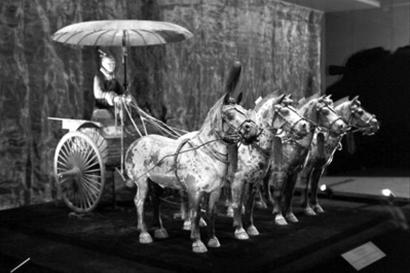 據(jù)介紹,秦俑館銅車馬共兩乘,是秦始皇入葬時的陪葬品之一,埋在陜西臨潼秦始皇陵封土西側(cè)。1980年12月,考古人員發(fā)現(xiàn)了它們,按排列的前后,將其編為一號和二號。此次在中國館展出的一號銅車馬為雙輪、單轅、駟馬系駕,總重約1061公斤。其主體為青銅所鑄,通體飾有精美彩繪,配有一千多件金銀配飾。