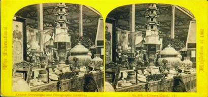 其中1862年倫敦世博會中國館立體照片,是迄今為止發(fā)現(xiàn)的世博會上有關(guān)中國館的最早的原版照片,彌足珍貴。照片由兩張一模一樣的正方形泛黃蛋白照組成。每張大小約在10厘米。底下一行英文小字顯示,照片由當年的倫敦立體攝影公司制作完成。