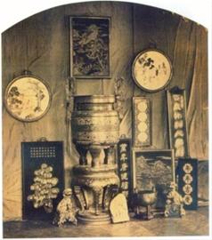 史料記載,1862年世博會上中國的參展規(guī)模很小,沒有單獨的展館,只是在主展廳內(nèi)有一個小小的展區(qū)展出一些陶瓷等中國土特產(chǎn)。照片印證了這一點。中國展示的有瓷器、佛像、琺瑯器、寶塔等,還有一張巨幅祖宗油畫。沒有獨立展館,但一個外國孩童正定睛觀看展品,初步顯示了東方藝術(shù)獨特魅力。