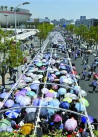 當記者沿著世博軸緩步來到博成路高架步道下方的沙特館排隊區(qū)域入口時,時間已是9:25。入口處的沙特館工作人員手上的告示牌已經(jīng)寫著“沙特館排隊時間約8小時”,不少游客看到標示后就放棄了排隊,但更多的游客選擇繼續(xù)堅持。已經(jīng)73歲的付老先生說:“之前就選定傳聞中很好看,但排隊時間長的沙特館作為世博游第一站,下定決心要把最難排到的場館先看掉!崩先耸虑耙褱蕚浜谜陉柮、攜帶式小椅、食物和水等物品,即使真要排9小時也要堅持下去。