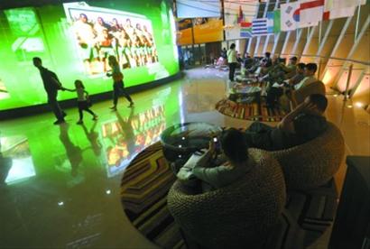 在館內(nèi),兩塊3D投影大屏幕已經(jīng)就位,讓游客可以看到身臨其境的3D世界杯直播,其信號(hào)來(lái)自南非的電視臺(tái)。今晚,這塊屏幕會(huì)高清直播開幕式和首場(chǎng)比賽。而在“球吧”門口,便是世界杯倒計(jì)時(shí)碑,一分一秒地計(jì)算著距離世界杯到來(lái)還有多少時(shí)間。