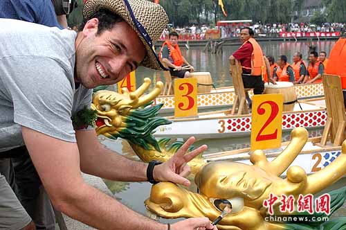 隨著裁判的一聲令下,龍舟賽開賽,現(xiàn)場陣陣歡呼加油聲。第一次到中國,看到這種比賽,Tomas好奇地頻頻按下快門。一邊看著15支隊伍的激烈爭奪競,一邊詢問著記者關于這項中國傳統(tǒng)民俗的由來和剛剛給龍“點睛”的典故,聽完記者的解釋后,Tomas贊嘆不斷:“太有意思了!”