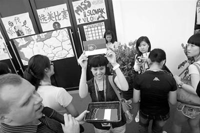 昨天下午2點(diǎn), 18名在斯洛伐克館等待入場的美女被邀請參加“女士之日”的選美大賽,比賽共分為兩個環(huán)節(jié),包括有關(guān)世博和斯洛伐克的問答,以及才藝表演。在決賽環(huán)節(jié),三位女士同時學(xué)唱一首斯洛伐克兒歌,現(xiàn)場的觀眾則成為決賽評委。最終,來自上海徐匯區(qū)的護(hù)士小姐沈瑾脫穎而出,獲得 “斯洛伐克館小姐”的榮譽(yù)稱號,她的大幅照片還將被掛在斯洛伐克館的貴賓廳。除了來自斯洛伐克館的眾多禮遇,她還能選擇多個熱門場館,直接從VIP通道入內(nèi)參觀。