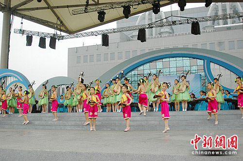 中新網(wǎng)上海6月27日電(趙龍)行云流水的古箏、歡快奔放的二胡、委婉鏗鏘的琵琶……今日伴著淅淅瀝瀝的雨聲,百余名蘇州少年帶來(lái)的“琴瑟滄浪”民樂(lè)演奏音樂(lè)會(huì),在世博園全球城市廣場(chǎng)奏響,讓中外觀眾領(lǐng)略了一把中國(guó)傳統(tǒng)民樂(lè)的魅力。