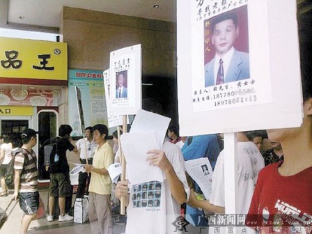 由于自己投資了1000萬(wàn)元跟南寧市某房地產(chǎn)公司合作開(kāi)發(fā)一個(gè)小區(qū),但該公司的法人鄭某竟將上億資金卷走,當(dāng)事人經(jīng)過(guò)幾年的尋找卻找不到鄭某。昨日,柳州市國(guó)泰房產(chǎn)開(kāi)發(fā)有限責(zé)任公司法人陳健美采取“非常手段”,帶著公司員工和親戚來(lái)到南寧市火車站、朝陽(yáng)廣場(chǎng)、萬(wàn)達(dá)廣場(chǎng)等繁華地帶,舉著鄭某的照片,懸賞1萬(wàn)元,“尋找南寧最大的老賴”,此舉吸引了不少市民的眼球。