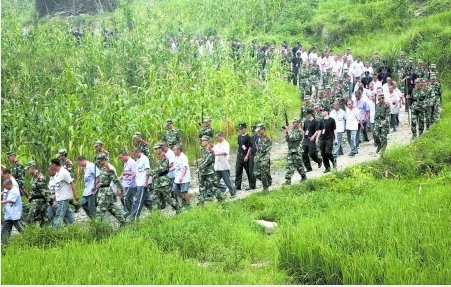 在武警官兵和監(jiān)獄民警的押送下,服刑人員按照編號(hào)每?jī)扇舜饕桓笔咒D,徒步翻山繞行。腳下是暴雨沖壞的碎石山路,兩邊不時(shí)有高高的玉米梗和綠油油的稻田。走了半個(gè)多小時(shí),隊(duì)伍到達(dá)了一處涵洞垮塌現(xiàn)場(chǎng)。狹窄的道路只容許三個(gè)人并排通過,為了防止出現(xiàn)意外,武警狙擊手提前在此持槍警戒,服刑人員們依次通過。