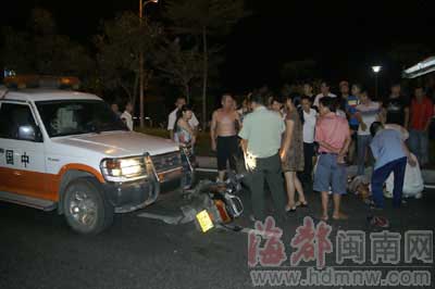 事發(fā)8月17日晚近10時(shí),黃先生說(shuō):“太突然了,我一下被撞飛,當(dāng)時(shí)馬上暈過去了!碑(dāng)晚,他和幾個(gè)同事在江濱路大排檔吃完飯后,分乘兩輛摩托車沿江濱路由東往西行駛,他開的摩托車上載著同事周女士。途經(jīng)洋老洲游泳池附近時(shí),黃先生突然感到后面有車撞來(lái),他和周女士被撞倒并被往前面推行了10多米,接著他就暈過去了。