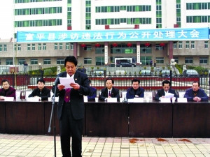 回應:記者在富平縣法院網(wǎng)看到該網(wǎng)站刊載了一張公開處理大會的照片,3月5日當天,站在富平縣政府廣場上念稿子的官員正是該縣法院副院長奧繪。背后列席的官員中,該縣政法委及法院的主要領(lǐng)導都在。