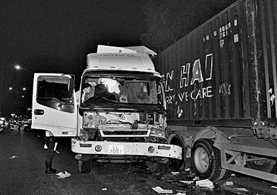 中新網(wǎng)7月9日電 據(jù)香港文匯報報道,香港屯門公路8日凌晨發(fā)生嚴(yán)重車禍。一輛密斗貨車疑在路面左穿右插失事,狂撼前面一輛貨柜車車尾,致?lián)躏L(fēng)玻璃甩脫;前座司機妻子疑沒有佩戴安全帶,如炮彈般從車頭飛出車外,再被密斗貨車卷入車底,左臂被車輪輾壓重傷。
