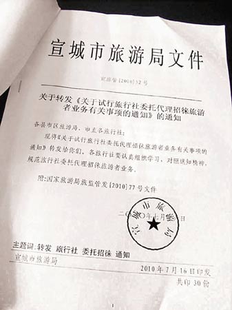 記者向當?shù)芈糜螛I(yè)界人士了解了一些情況,據(jù)說整個宣城市,包括涇縣在內,沒有一家旅行社具備組織出境游的資格。當?shù)芈眯猩缱疃酁楹戏省⒛暇┑鹊芈眯猩缱龃頂埧偷臉I(yè)務。