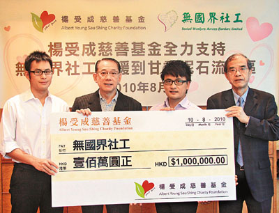 而任“無國界社工”永遠(yuǎn)榮譽(yù)會(huì)長的英皇集團(tuán)主席楊受成昨日以“楊受成慈善基金”名義捐出100萬港元予無國界社工,并安排該組織之支持團(tuán)隊(duì)親赴災(zāi)區(qū)協(xié)助賑災(zāi)工作!盁o國界社工”將派出5名義工于本周五或以前到災(zāi)區(qū)視察災(zāi)情,并安排該100萬元善款購買災(zāi)民目前最需要的物資,例如一般生活必需品等。首批物資最快可于本月20日送到災(zāi)民手中。中聯(lián)辦社會(huì)工作部副部長黃清芳出席支票交接儀式。