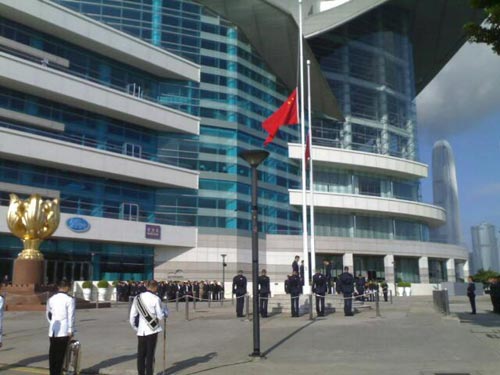 特區(qū)政府在灣仔金紫荊廣場(chǎng)舉行升旗及下半旗儀式,并為馬尼拉挾持人質(zhì)事件中的死難者,默哀三分鐘。約500名市民參與儀式,部分人感觸落淚。