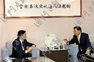 譚俊榮二十四日下午在臺(tái)北禮節(jié)性拜會(huì);鶗(huì)董事長(zhǎng)江丙坤,受到熱情接待。雙方深入交換了深化澳臺(tái)關(guān)系發(fā)展,促進(jìn)兩地文化、觀光、旅游、經(jīng)濟(jì)等交流的意見(jiàn)。江丙坤明確表示,支持特區(qū)政府推動(dòng)澳臺(tái)關(guān)系發(fā)展。愿意發(fā)揮;鶗(huì)的作用和影響力,協(xié)助特區(qū)政府與臺(tái)灣有關(guān)方面磋商在臺(tái)設(shè)立辦事處及澳門高校學(xué)歷認(rèn)可等事宜。