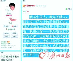 成龍25日的言論在微博上發(fā)表后,隨即在網(wǎng)絡(luò)上瘋傳,在各大網(wǎng)絡(luò)的討論區(qū)都推出了這次成龍言論的專題,網(wǎng)友們紛紛對成龍表示很不滿。