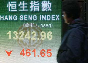 華爾街股市日前急挫3%,環(huán)球股市再現(xiàn)骨牌式的下跌,韓國(guó)股市暴跌超過(guò)6%,日股挫近5%,香港股市也難逃一劫,加上“大笨象”匯控被“摩笛”嚇倒,拖累恒指15日裂口低開(kāi)568點(diǎn),開(kāi)市不足10分鐘,恒指在13000點(diǎn)岌岌可危,在中午收市前最多暴跌800點(diǎn)至12904點(diǎn)低位。