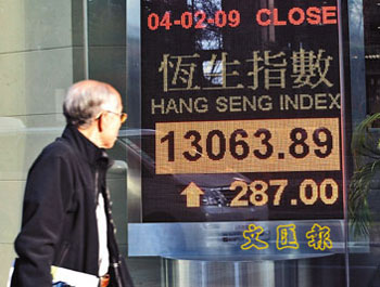 中新網(wǎng)2月5日電 據(jù)香港《文匯報(bào)》報(bào)道,港股跟隨美股及內(nèi)地股市反彈,大市高開253點(diǎn),大市在重磅股匯控和中移動(dòng)雙雙約升2%帶動(dòng)下,重越13000點(diǎn),一度升逾330點(diǎn),全日收?qǐng)?bào)13063點(diǎn),升287點(diǎn),成交額365.3億元。